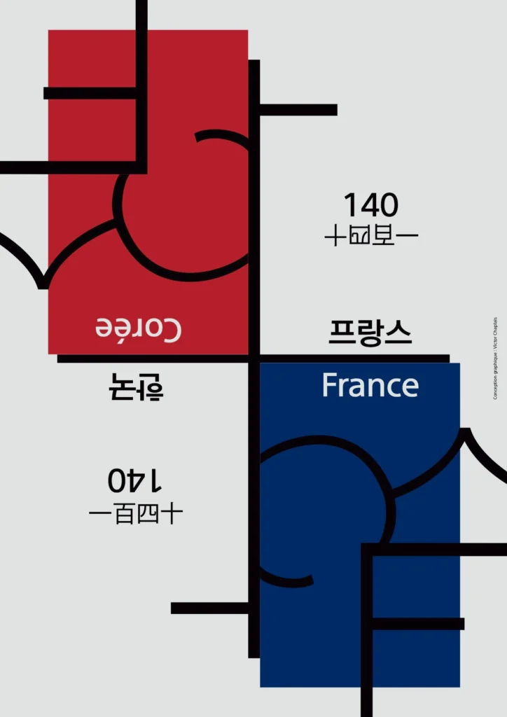 Mon objectif était de jouer sur l’affichage de l’affiche selon le pays où elle est présentée. J’ai donc créé un effet miroir du texte, de sorte que l’affiche soit accrochée à l’inverse : la Corée en bas à droite en France et la France en bas à droite en Corée.